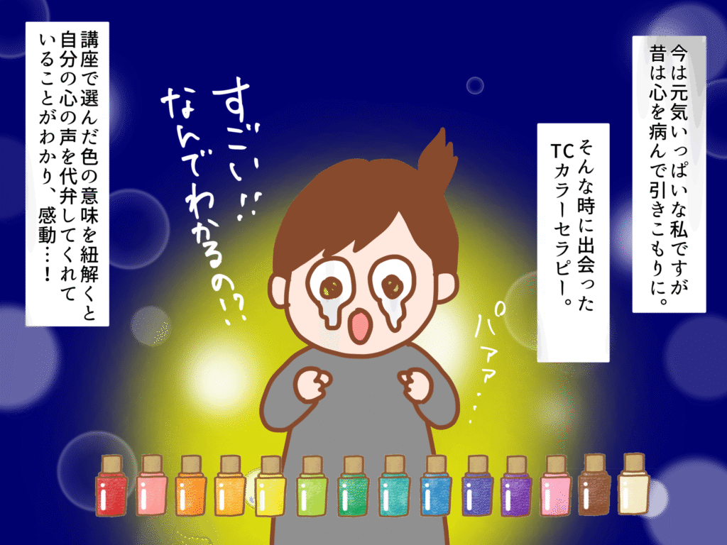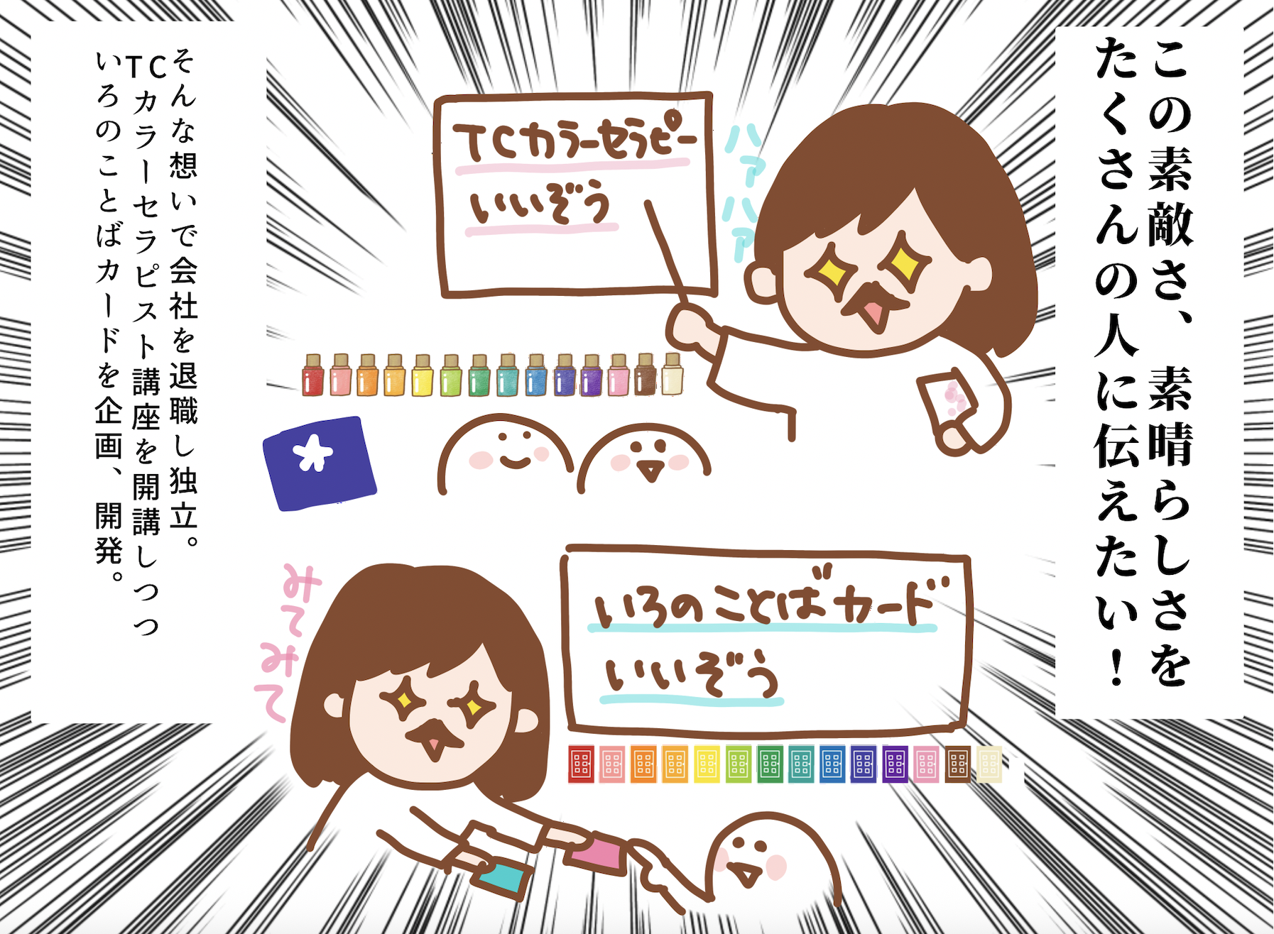 2009年にTCカラーセラピーに出会い、人生観が180度変わる。「色を選ぶだけで自分の気持ちがわかるってスゴイ!」と色の面白さ、奥深さに魅了され、2000人以上のセッション経験を積む。持ち前の明るさとイラストを活かしたTCカラーセラピスト養成講座が評判となり、2018年に会社を退職し、独立。現在、国内外に生徒が約700名以上いる。